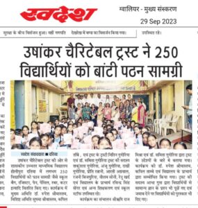 27 सितंबर को उषांकर चैरिटेबल ट्रस्ट की ओर से शासकीय उच्चतर माध्यमिक विद्यालय होलीपुरा दतिया में लगभग 250 विद्यार्थियों को पठन सामग्री वितरित किए गए।